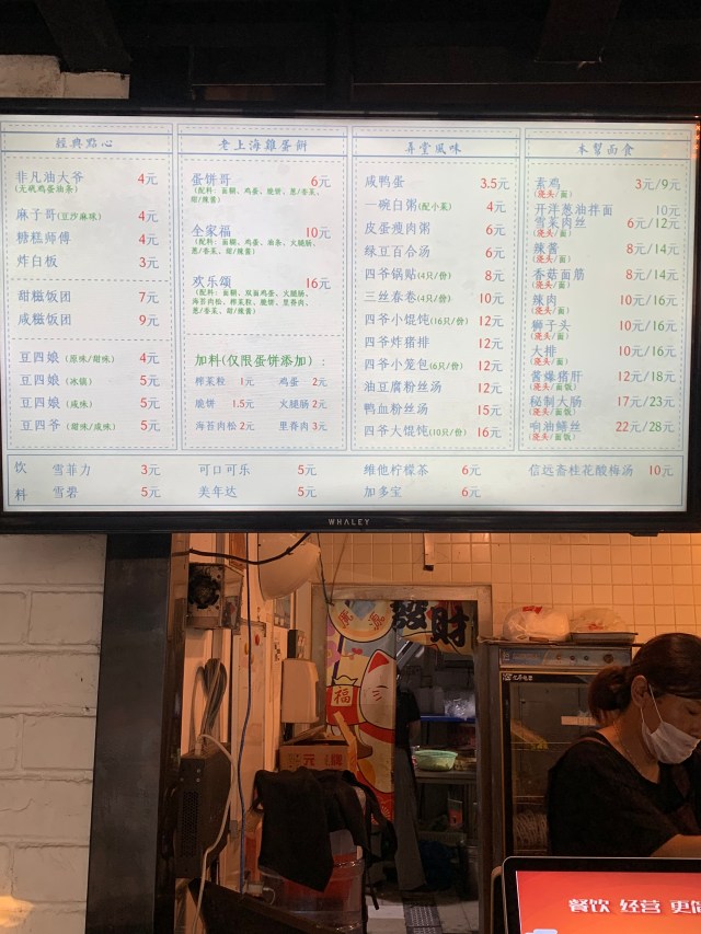 早上售賣麵條、油條、軟蛋餅、炸豬排、燒餅、豆漿、豆腐花,全部都是傳統的上海早餐。