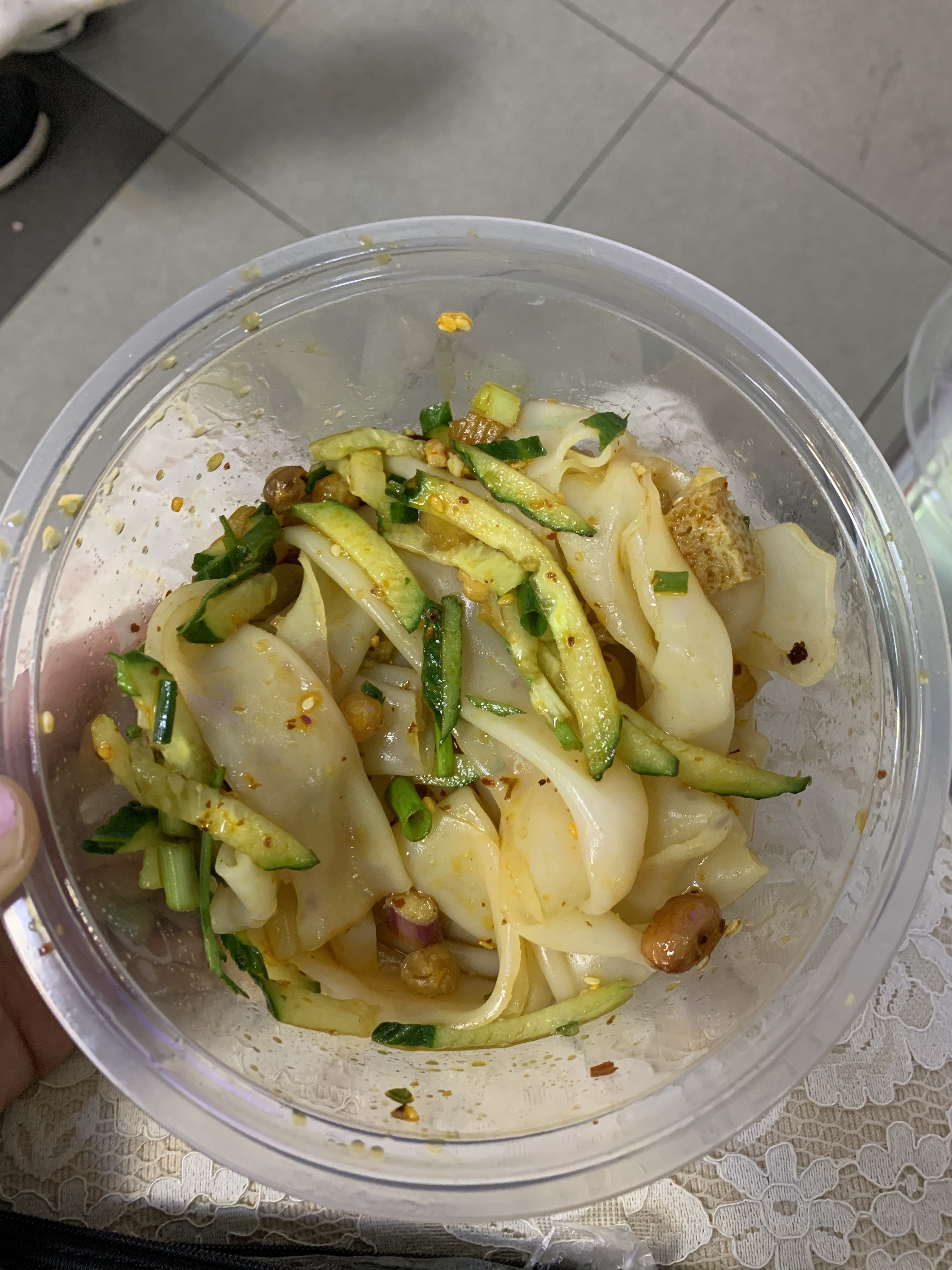 我揀選招撈麵「老北京麻醬麵」。麵條淋上麻醬汁,而基本配菜有旺菜、甘筍絲、青瓜絲及花生,加上一起,麻醬汁夠濃郁份量亦夠多,老公和我是分吃的。