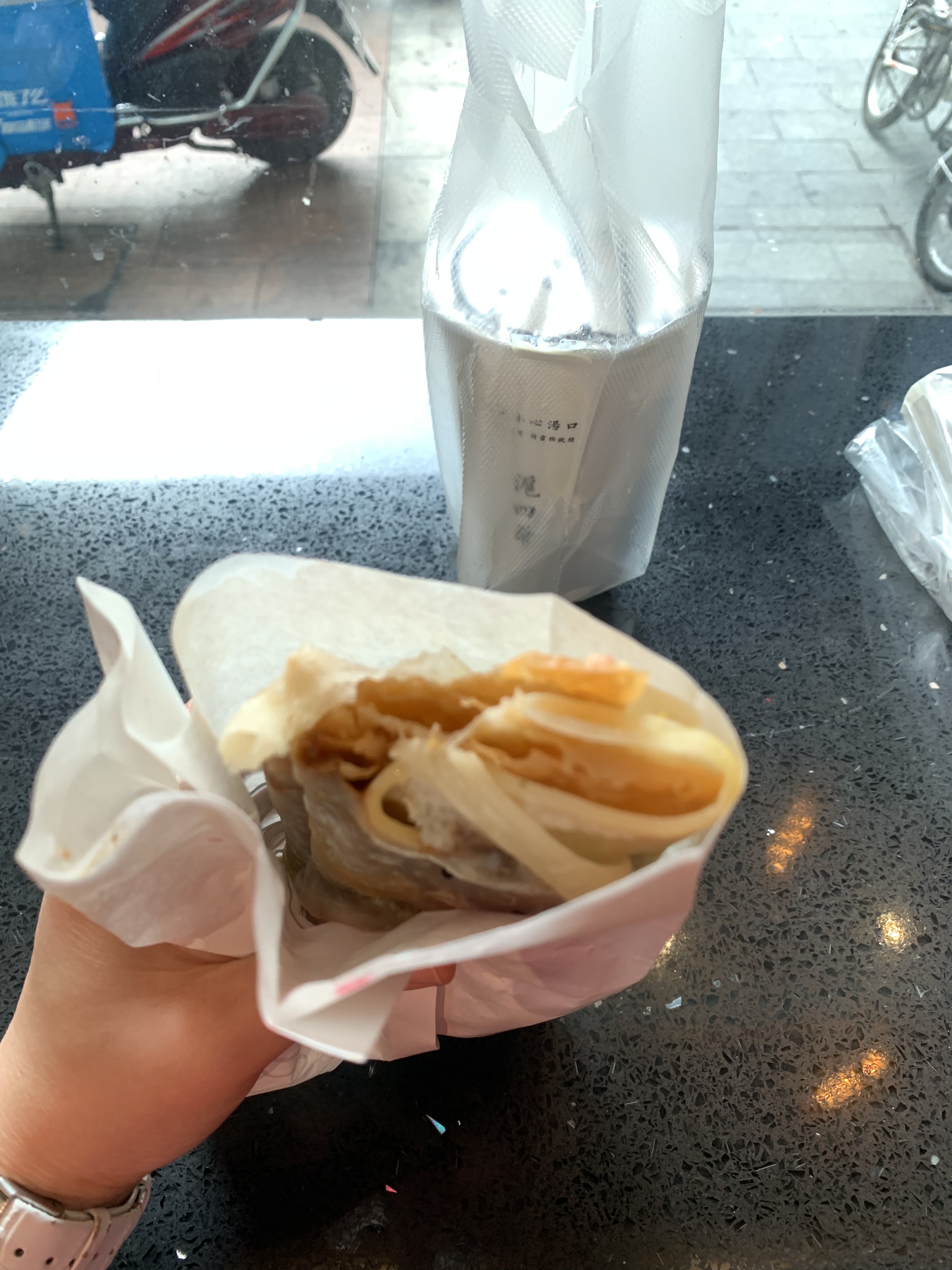 份量很大,用面糊做成的外皮,裏面有雞蛋、油條、蔥、香菜和甜辣醬混合而成,很可口。