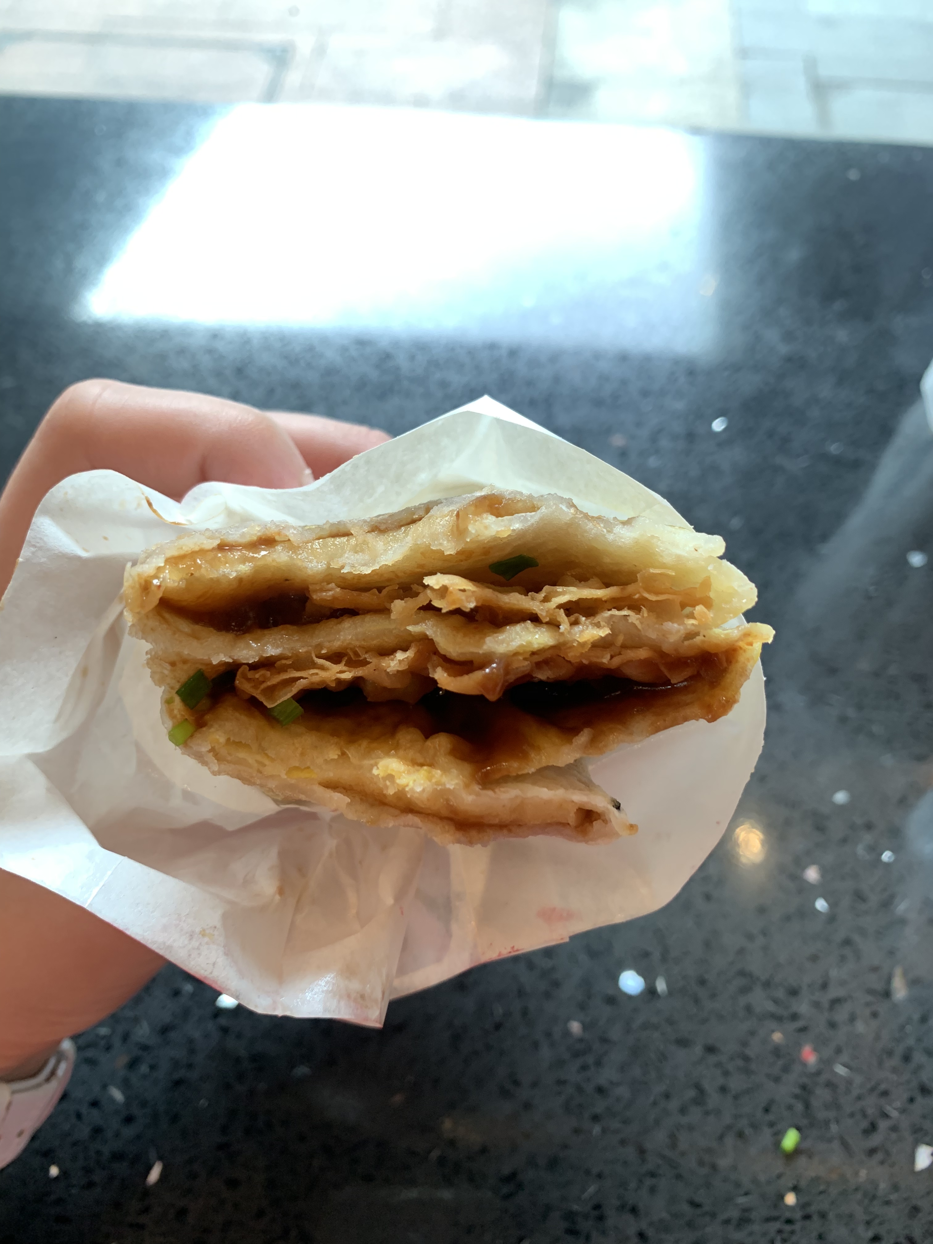 份量很大,用面糊做成的外皮,裏面有雞蛋、油條、蔥、香菜和甜辣醬混合而成,很可口。