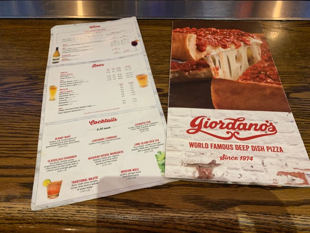 服務生送來的餐牌,上面寫著‘Chicago’s Famous Deep Dish Pizza‘。除了必吃的Stuffed Pizza外,Giordano’s也有售賣薄皮和超薄皮的Pizza,Pizza也可以自己加料的。